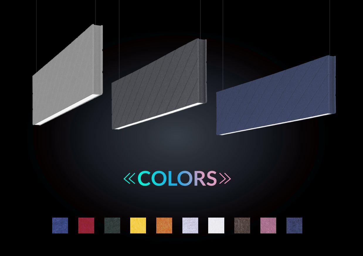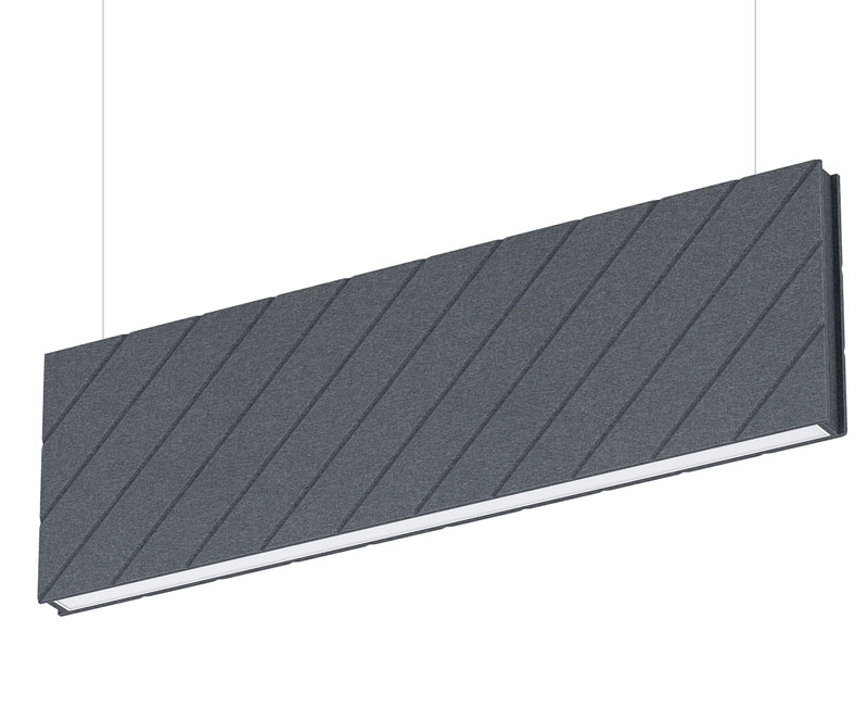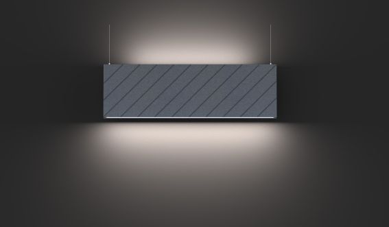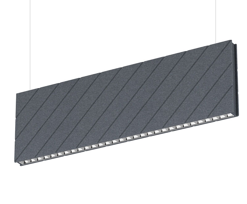 LED irodai függőlámpák különleges hangelnyelő házzal. A 100%-ban polyetilénből készült, sűrű rostos anyag erős hangelnyelő képességgel bír, amivel nagyban növelhető az akusztikai komfort. A tűzálló és nem toxikus burkolat egyedi, modern megjelenést, míg a kiváló minőségű, mélyre ültetett optikai lencsék magasfokú káprázásvédelmet biztosítanak.