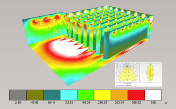 A keskeny magasraktár folyosók hatékony világítása különleges megoldásokat követel. Az LitePro (korábbi nevén accuLED) lámpát kifejezetten erre a feladatra tervezték: speciális 30° × 100°-os aszimmetrikus világítási szögű optikával szerelve akár 12-14 méteres magasságból is megfelelő megvilágítást biztosít.